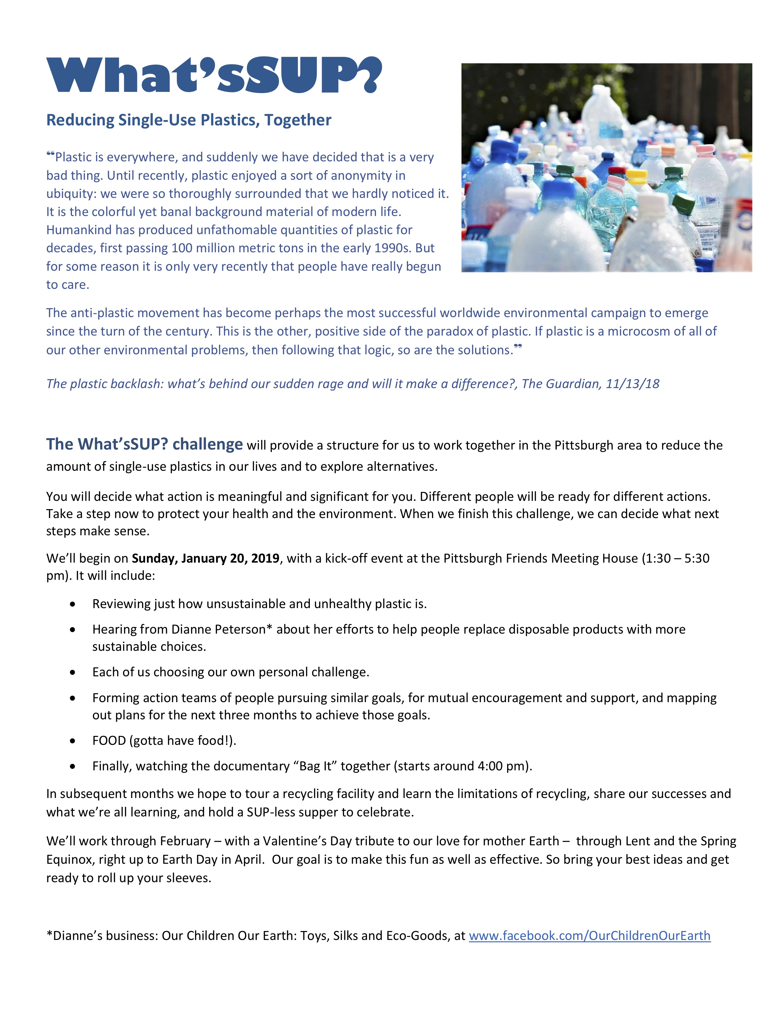 Please join us for the kick-off of the What’sSUP Challenge on January 20,(Pittsburgh Friends Meeting House in Oakland, 1:30 – 5:30)