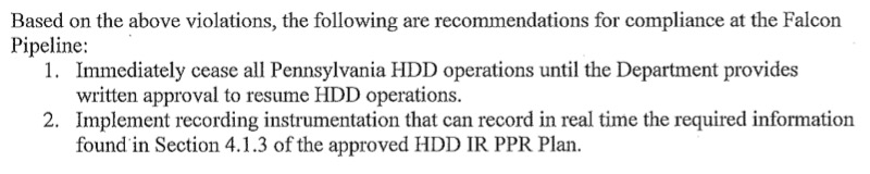 The violation notice goes on to recommend that Shell “immediately cease all Pennsylvania HDD [horizontal directional drill] operations until the Department provides written approval to resume HDD operations: