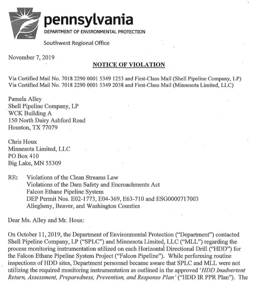 The PA DEP issued a notice of violation to Shell Pipeline Company, LP on November 7, 2019, in which it found that Shell was “not utilizing the required monitoring instrumentation” related to horizontal directional drilling “HDD.” The original link to the full violation text can be found here: https://www.dep.pa.gov/Business/ProgramIntegration/Pennsylvania-Pipeline-Portal/Pages/Shell.aspx . The actual violation letter can be found here as a PDF.