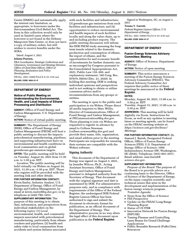 Attached please find the Federal Register notice published on August 9, 2021, which formally announced this virtual public meeting and provides additional details for those interested in participating. If you would like to attend, please RSVP to Colleen Newman via email at Colleen.Newman@hq.doe.gov by Friday, August 20, 2021. The link to the meeting and other additional details will be sent to registrants prior to the meeting.
