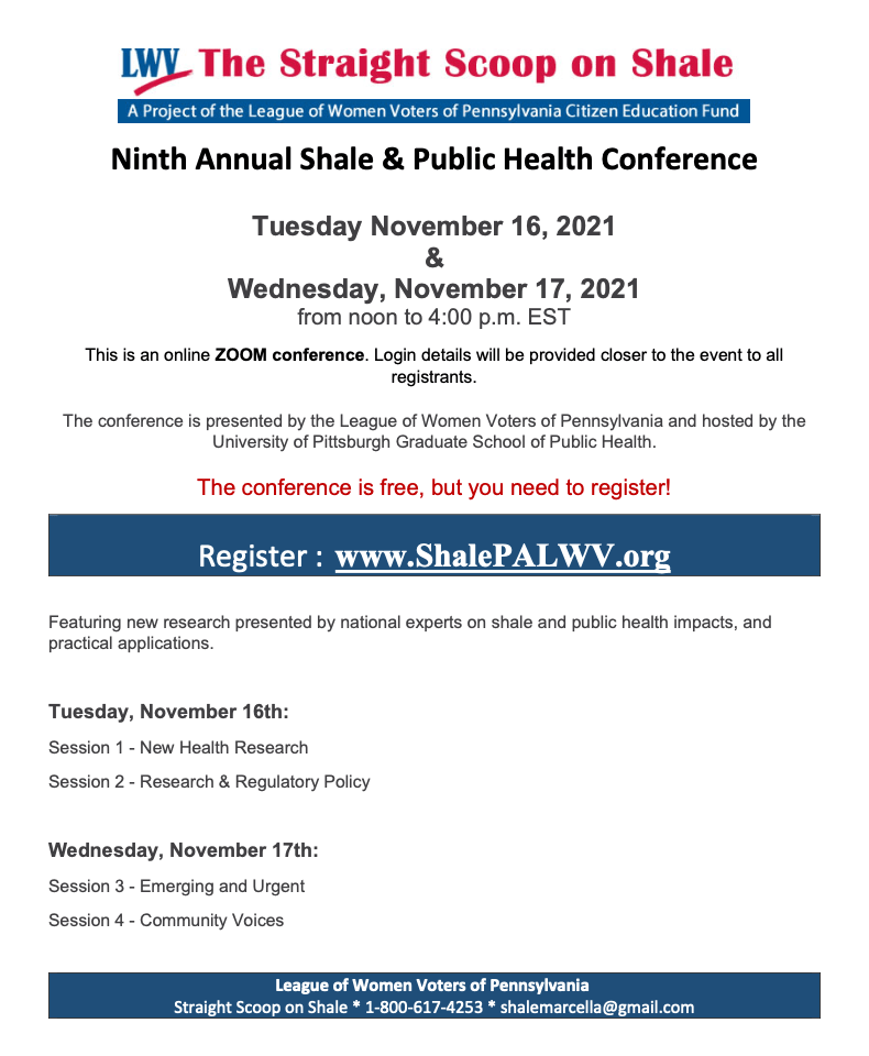 The Ninth Annual Shale & Public Health Conference is coming up in November! See you there? Register for the free event at https://www.shalepalwv.org/ .
